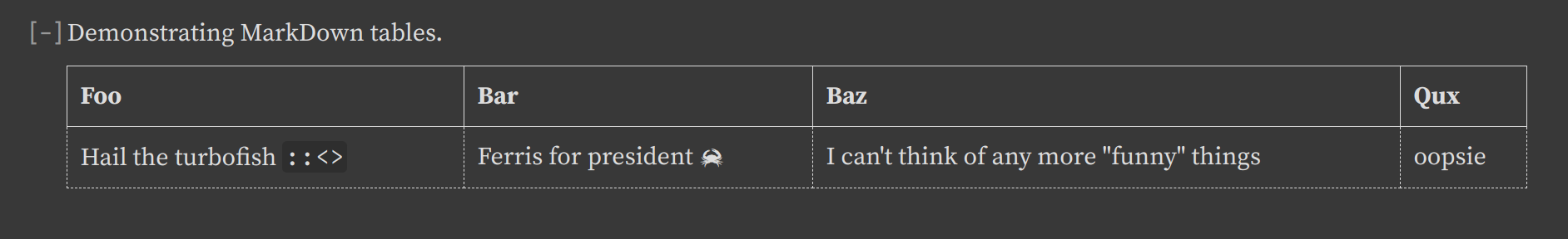//! | Hail the turbofish `::<>` | Ferris for president | I can't think of any more "funny" things | oopsie |