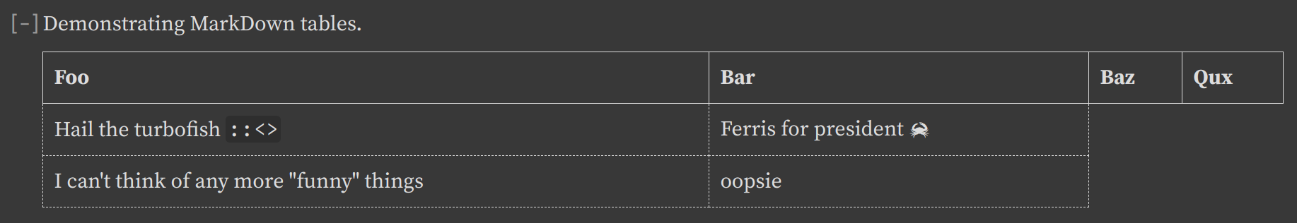//! Demonstrating MarkDown tables.