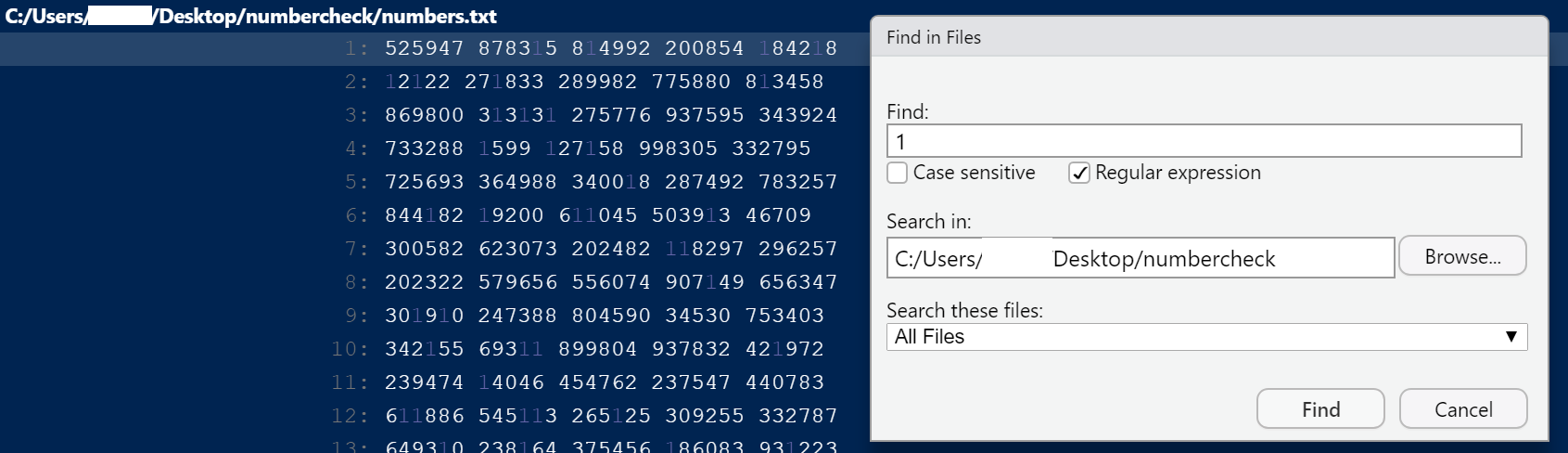 但是,在回答有关如何查找数字数字的问题时,在“Files”对话框中勾选“正则表达式”选项中的任意一项操作: