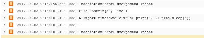 ...args: ["-c $'import time\\nwhile (True):\\n print(\".\");time.sleep(5);'"]