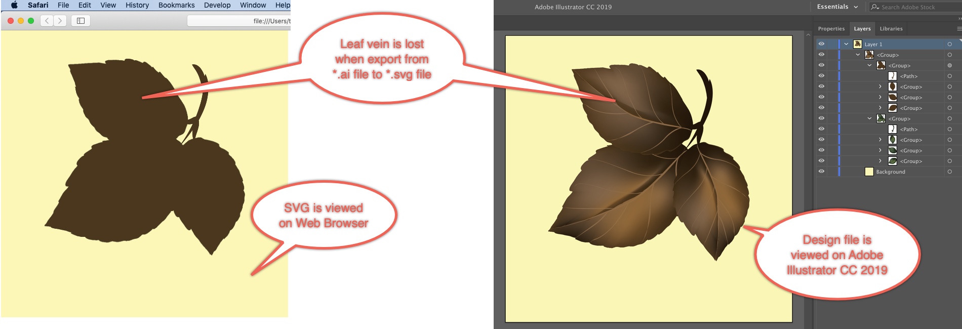 当从*.ai文件导出到*.svg文件时,我遇到了问题。当我使用web浏览器查看*.svg文件时,图像不正确(叶脉丢失)。