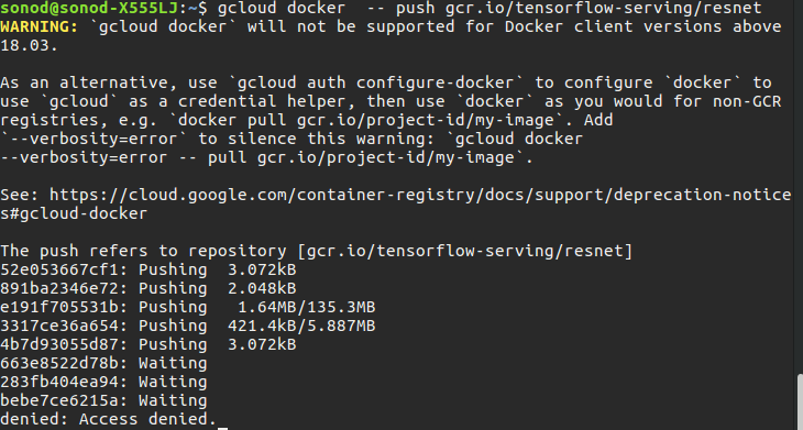 所以我做了一个基于tensorflow-servings和Kubernetes的教程。除了推进到群集的对接映像外,所有步骤都正常工作。