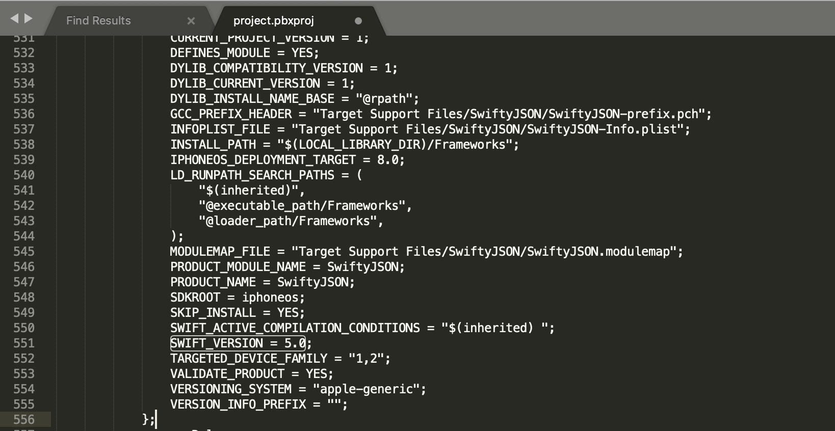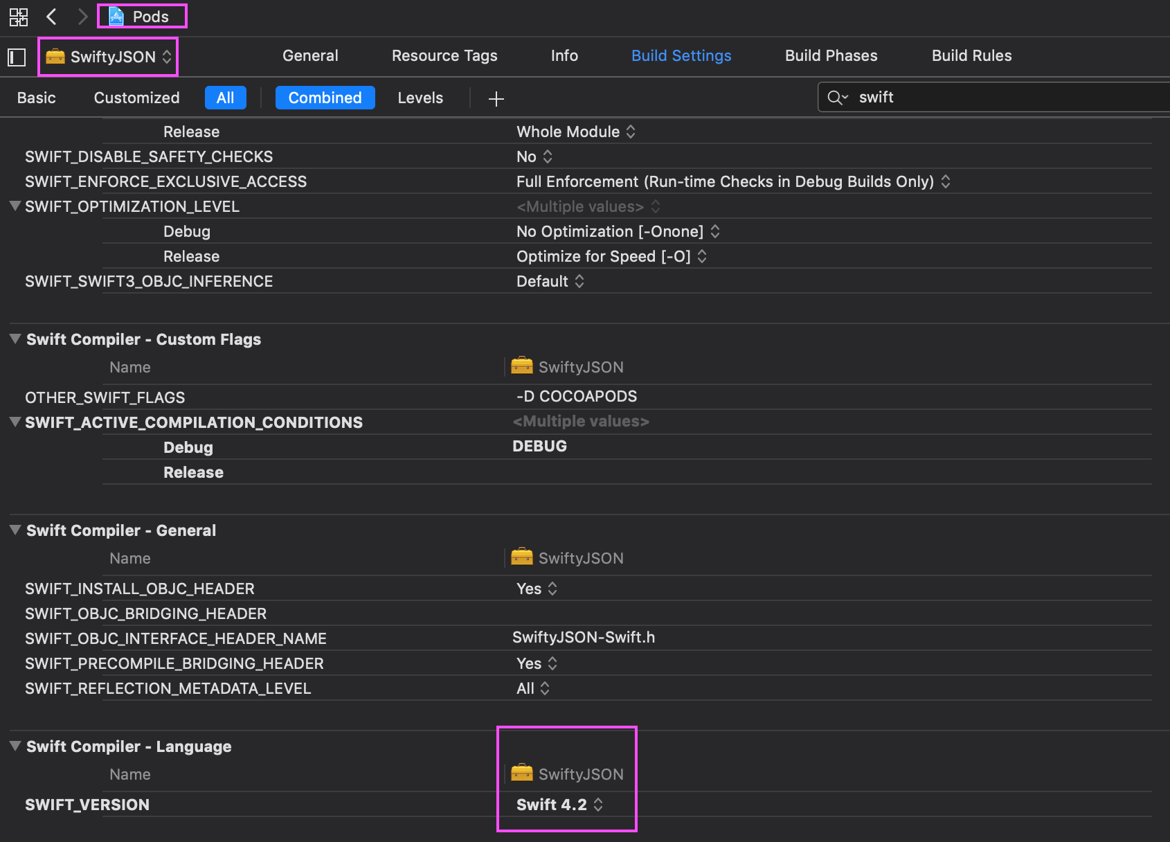 我找到了。我对XCode不太熟悉,所以对我来说不是很简单。在左侧的项目树上单击"Pods“,然后单击下拉菜单,从左上角的列表中选择SwiftyJSON。然后更改Swift版本,该版本被设置为5.0。看这张照片。