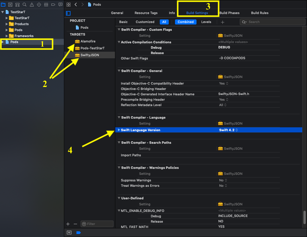 如果您安装了多个依赖项,则必须为每个依赖项设置“Swift语言版本”。(看一下图像,这个项目有两个依赖项: Alamofire和SwiftyJSON,所以我已经做了2次步骤2到步骤4)
