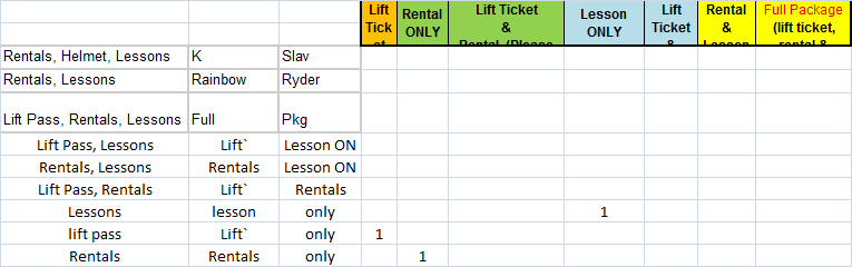 =IF(AND('Paste Here'!B2="Rentals",NOT(OR('Paste Here'!B2="Lift Pass",'Paste Here'!B2="Lessons"))),1,"")只有电梯通行证: