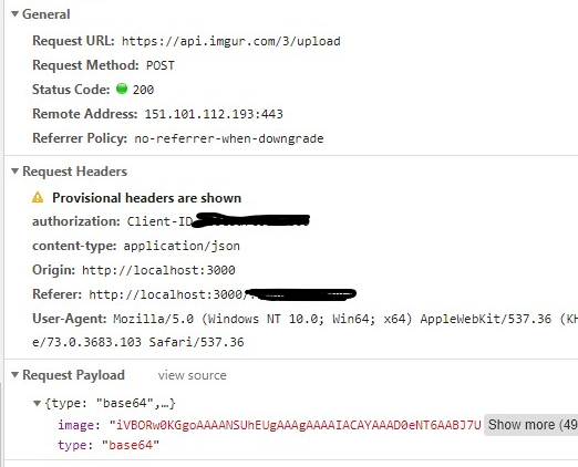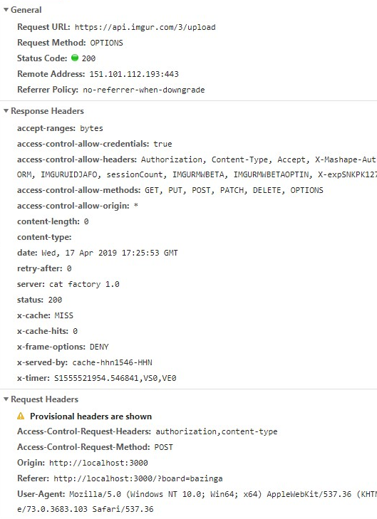 Access to XMLHttpRequest at 'https://api.imgur.com/3/upload' from origin 'http://localhost:3000' has been blocked by CORS policy: No 'Access-Control-Allow-Origin' header is present on the requested resource.但飞行前请求包含Access-Control-Allow-Origin报头: