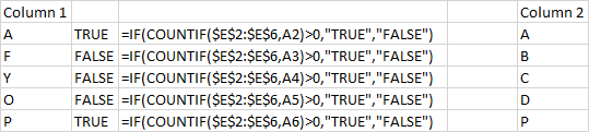 =IF(COUNTIF($E$2:$E$6,A2)>0,"TRUE","FALSE")结果: