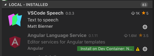 Local — Installed部分中,向下滚动以查看尚未安装在远程上的工作区扩展。这些已褪色,并有一个绿色的安装按钮在他们旁边。在这里,VS Code Speech是在本地运行的UI扩展,而Angular Language Service是本地安装的工作区扩展,但尚未在远程上安装: