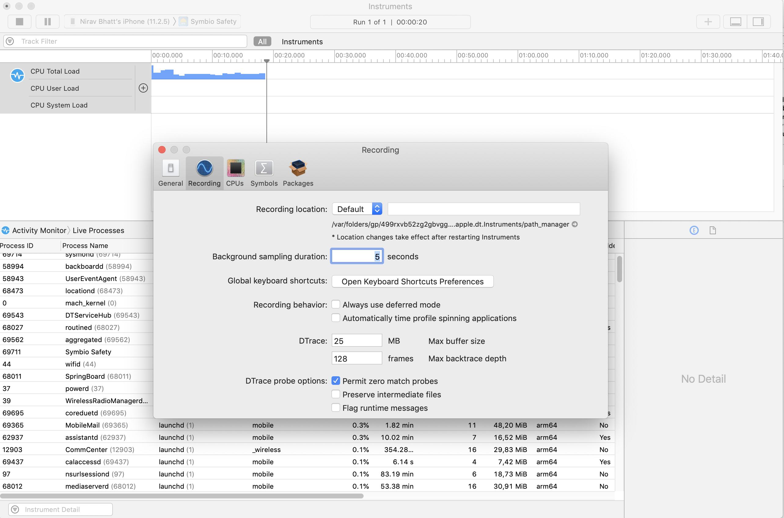 pause和unpause您想要的操作分析。Background Sampling Duration参数-它允许您指定它记录活动的频率。播放此参数。您可以获得所需的文件大小。- If you observe below screenshot: There is also one more parameter named `max backtrace depth`. It changes size of your recorded call stack. You can also play with it to observe file size changes.