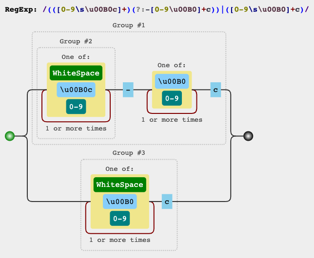 -? -一个可选的连字符\d+ - 1+数字(?:\.\d+)? -一个可选的小数部分\s* - 0+白空间° -度符号\s* - 0+白空间c - c char.(?:\s*-\s*<ABOVE_BLOCK>)?匹配包含0+空白空间的连字符的1或0次重复,然后匹配上面描述的相同块。