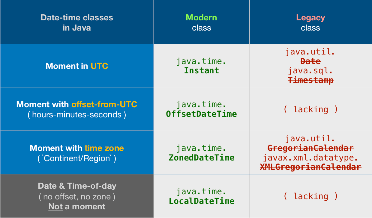 在其他答案中已经讨论过使用java.time,但是那些使用错误类的是:LocalDateTime。这完全是错误的类使用,因为它不代表一个时刻。它代表了全球时区范围约26-27小时的潜在时刻。这个类拥有一个日期和一天的时间,但没有时区的概念或与世界协调时相抵消的概念。因此,如果一个LocalDateTime物体在今年1月23日下午12点举行,我们不知道那是东京的中午,加尔各答的中午,巴黎的中午,或者蒙特雷的中午--所有的时刻,相隔几个小时都是非常不同的时刻。