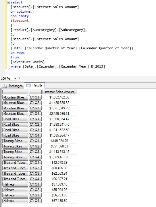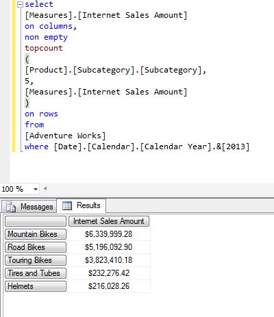 (select topcount([Product].[Subcategory].[Subcategory],5,[Measures].[Internet Sales Amount]) on 0 from [Adventure Works] )
