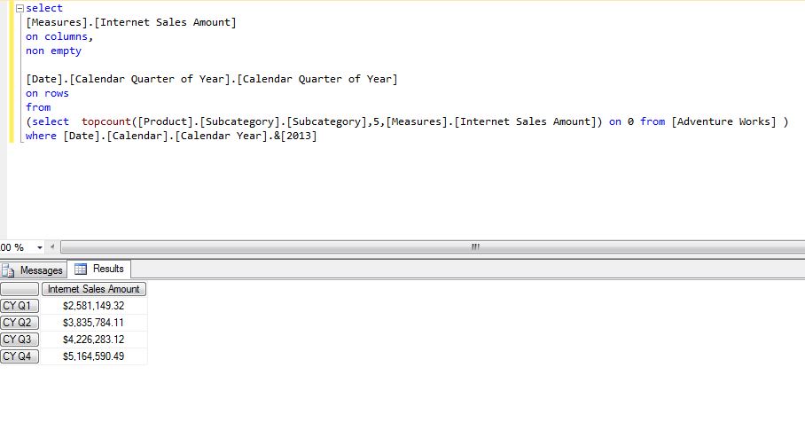 DIMENSION PROPERTIES MEMBER_CAPTION, MEMBER_VALUE, MEMBER_UNIQUE_NAME ON ROWS FROM ( SELECT ( -{ [DWH REF STORE].[H_STORE].[TERRITORY].&[N/A].&[N/A] } ) ON COLUMNS FROM ( SELECT ( { [DWH REF DATE].[H_CALENDER].[YEAR NUM].&[2012] } ) ON COLUMNS FROM [SALES CUBE])) 我真正想要的是,按年排名前5的商店,然后按5家店的四分之一获得销售。