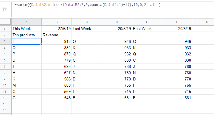 =sortn({Data!A2:A,index(Data!B2:Z,0,match(F1,Data!B1:1,0))},10,0,2,false)发布于 2019-05-31 19:16:12
