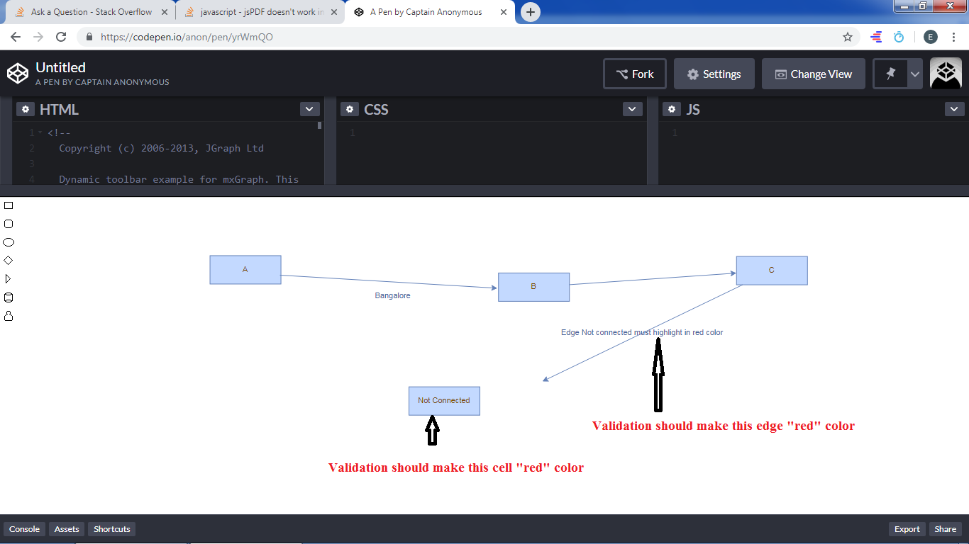 var graphState ={"tagName":"mxGraphModel","children":[{"tagName":"root","children":[{"tagName":"mxCell","attributes":{"id":"0"}},{"tagName":"mxCell","attributes":{"id":"1","parent":"0"}},{"tagName":"mxCell","attributes":{"id":"2","value":"A","style":"","parent":"1","vertex":"1"},"children":[{"tagName":"mxGeometry","attributes":{"x":"271.56251525878906","y":"82.44792175292969","width":"100","height":"40","as":"geometry"}}]},{"tagName":"mxCell","attributes":{"id":"3","value":"B","style":"","parent":"1","vertex":"1"},"children":[{"tagName":"mxGeometry","attributes":{"x":"678.2291717529297","y":"106.89236450195312","width":"100","height":"40","as":"geometry"}}]},{"tagName":"mxCell","attributes":{"id":"4","value":"Bangalore","parent":"1","edge":"1"},"children":[{"tagName":"mxGeometry","attributes":{"x":"0.0511","y":"-20","relative":"1","as":"geometry"},"children":[{"tagName":"mxPoint","attributes":{"x":"370.06251525878906","y":"109.95338610053051","as":"sourcePoint"}},{"tagName":"mxPoint","attributes":{"x":"676.7291717529297","y":"128.3869001543523","as":"targetPoint"}},{"tagName":"mxPoint","attributes":{"as":"offset"}}]}]},{"tagName":"mxCell","attributes":{"id":"5","value":"C","style":"","parent":"1","vertex":"1"},"children":[{"tagName":"mxGeometry","attributes":{"x":"1013.7847747802734","y":"83.55902862548828","width":"100","height":"40","as":"geometry"}}]},{"tagName":"mxCell","attributes":{"id":"6","parent":"1","source":"3","target":"5","edge":"1"},"children":[{"tagName":"mxGeometry","attributes":{"relative":"1","as":"geometry"}}]},{"tagName":"mxCell","attributes":{"id":"7","value":"Not Connected","style":"","vertex":"1","parent":"1"},"children":[{"tagName":"mxGeometry","attributes":{"x":"552","y":"267.640625","width":"100","height":"40","as":"geometry"}}]},{"tagName":"mxCell","attributes":{"id":"8","value":"Edge Not connected must highlight in red color","edge":"1","parent":"1","source":"5"},"children":[{"tagName":"mxGeometry","attributes":{"relative":"1","as":"geometry"},"children":[{"tagName":"mxPoint","attributes":{"x":"740","y":"260","as":"targetPoint"}}]}]}]}]};