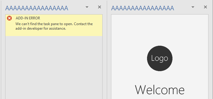 自动打开的任务窗格有一个错误,该错误声明为we can't find the task pane to open。另一方面,单击“带状”允许任务窗格按常规方式打开,并与破损的自动打开的任务窗格并排打开,如下图所示:
