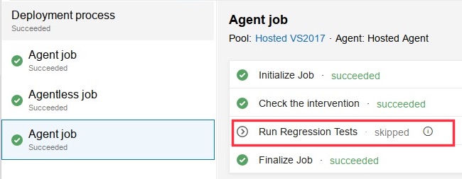 在烟雾测试之后,我插入了一个手动干预任务,允许Devs选择运行回归测试(恢复)或退出进程(拒绝)。如果所有以前的任务(部署、集成和冒烟)都通过,并且手动干预被拒绝,I希望将发布管道标记为成功。