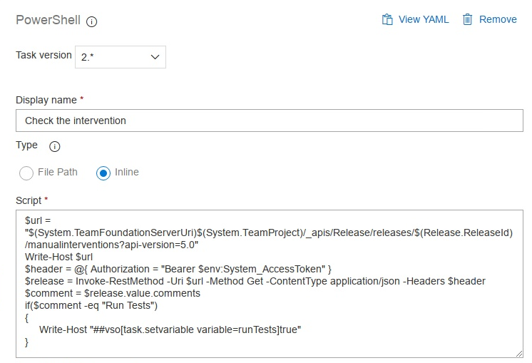 例如,如果批准继续使用“运行测试”进行干预,则将执行Regresstions测试。因此,您需要一个PowerShell脚本来检查批准所写的内容,如果审批文本是“运行测试”,我们将设置一个新变量runTest