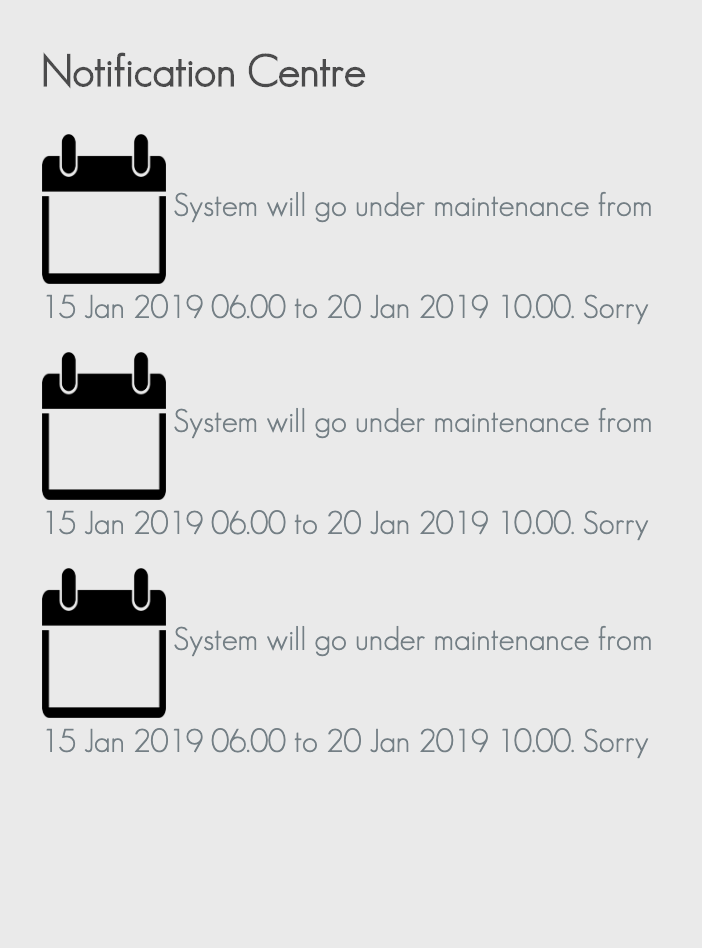 <span>System will go under maintenance from 15 Jan 2019 06.00 to 20 Jan 2019 10.00. Sorry for any inconveniences caused.</span>