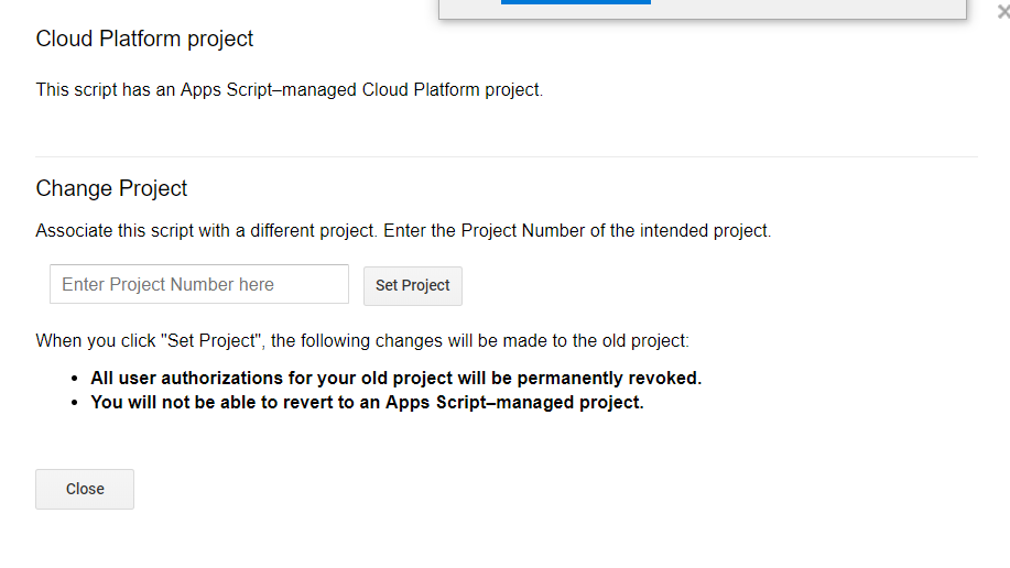 这是因为由于4月8日释放不能再查看分配给您的项目的默认GCP (也就是说,如果您在发布后创建了该项目)。如果重新分配标准 GCP正确,则该链接将出现在对话框中,代替此脚本具有Apps脚本托管云平台项目占位符。