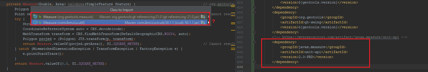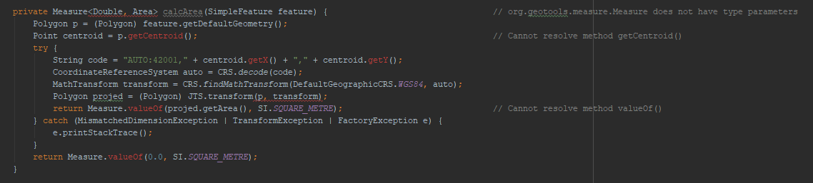 具体来说,在GeoTools Maven Quickstart 这里之后,仍然会得到org.geotools.measure.Measure.valueOf()和org.opengis.geometry.coordinate.Polygon.getCentroid()的Cannot resolve method错误。奇怪的是,对于前者,我找到了一些源代码,它说它使用javax.measure.Measure,但我在那进口上也没有运气。