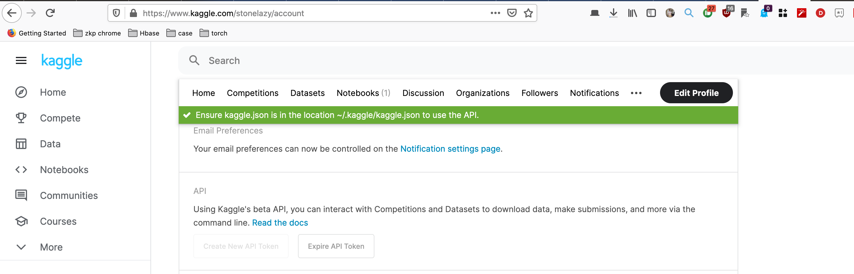 在我的mac电脑上运行jupyter笔记本时,我没有遇到这个问题,但是由于我想使用google的gpu作为我的模型,所以我开始使用google。因为kaggle期望用户名和API -键位于位于kaggle.json目录中的.kaggle文件中,所以我首先创建了目录.kaggle,然后创建了文件kaggle.json,然后将用户名和api-键写入其中(下面的示例不显示用户名和api-key)。然后,我尝试为kaggle在调用kaggle下载命令时使用json文件配置路径。