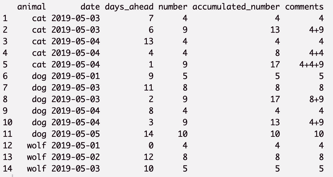dt = data.frame(animal, date, days_ahead, number) %>% arrange(animal, date)