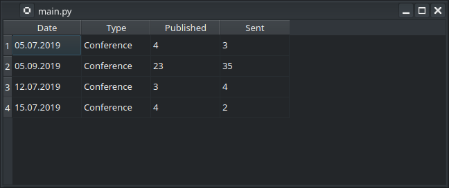 data = "{\"events\": {\"050719\": {\"Type\": \"Conference\", \"Published\": \"4\", \"Sent\": \"3\", \"Date\": \"05.07.2019\"}, \"050919\": {\"Type\": \"Conference\", \"Published\": \"23\", \"Sent\": \"35\", \"Date\": \"05.09.2019\"}, \"120719\": {\"Type\": \"Conference\", \"Published\": \"3\", \"Sent\": \"4\", \"Date\": \"12.07.2019\"}, \"150719\": {\"Type\": \"Conference\", \"Published\": \"4\", \"Date\": \"15.07.2019\", \"Sent\": \"2\"}}}"