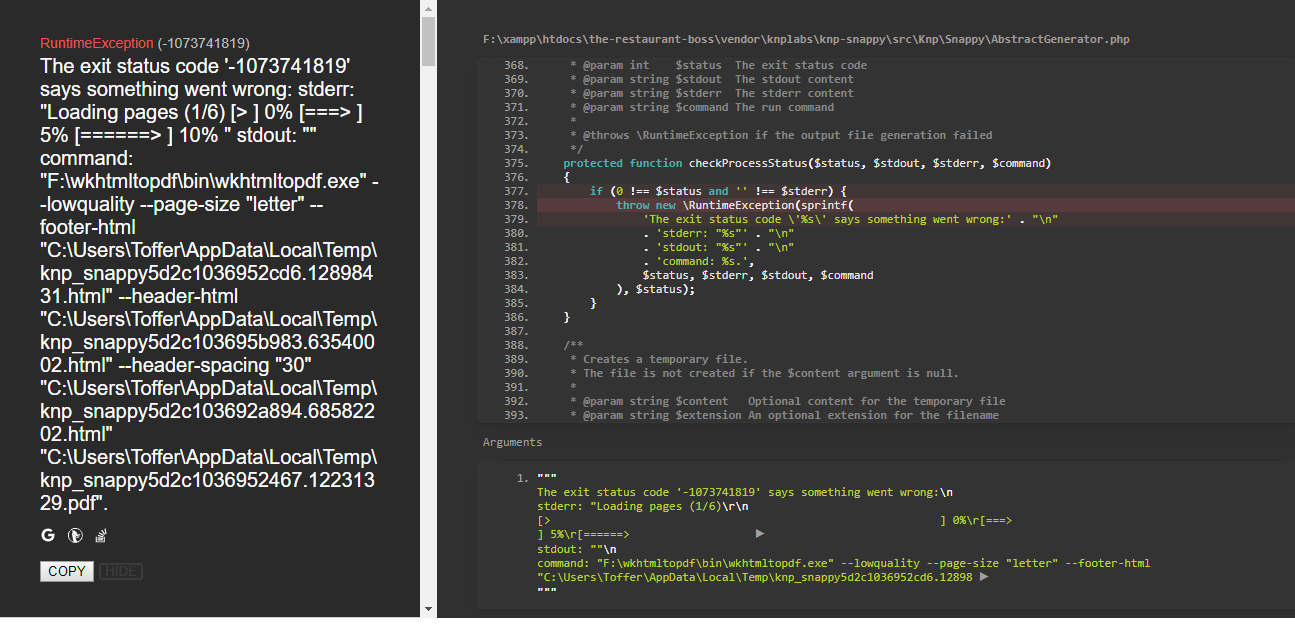确保如果在视图中使用任何图像或外部样式表,则正确定义它们的路径。如果它们不是,您的HTML将在浏览器中正常工作,但将其用于wkhtmltopdf将引发类似于此的错误。