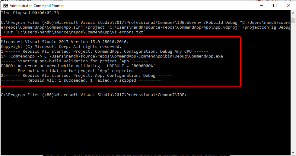 -启动项目“App”的预构建验证-错误:验证过程中发生了错误。HRESULT = '8000000A‘
