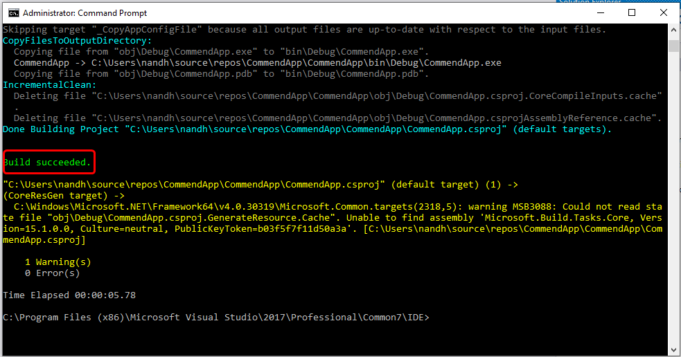 C:\Users\nandh\source\repos\CommendApp\CommendApp\CommendApp.csproj命令,用于生成项目文件,该命令已成功运行。