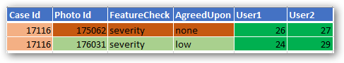 我有一些不同案例的分析数据。每个案例与一张或多张照片相关联。每张照片由两个用户进行分析。存储的数据看起来像