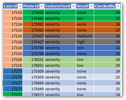 病例Id,照片Id,FeatureCheck,结果,CheckedBy 17116,173442,严重性,无,24,176,173442,严重性,低,25,176,175062,严重性,无,26,17116,175062,严重性,无,27,176,175427,严重性,中度,24,17116,175427,严重性,高,高,28,176,175748,严重程度,低,22,176,175748,严重度,无,30,176,176031,严重度,24 176,176,176031,严重性,低,29,177,175309,严重度,无,24 177,175309,严重度,无,严重度,25,17277,175649,严重度,无,1724,177,5649,无。