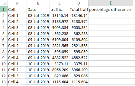 获得了每个流量的总流量。与前一天相比,我正在试图计算每个小区的流量之间的差异。