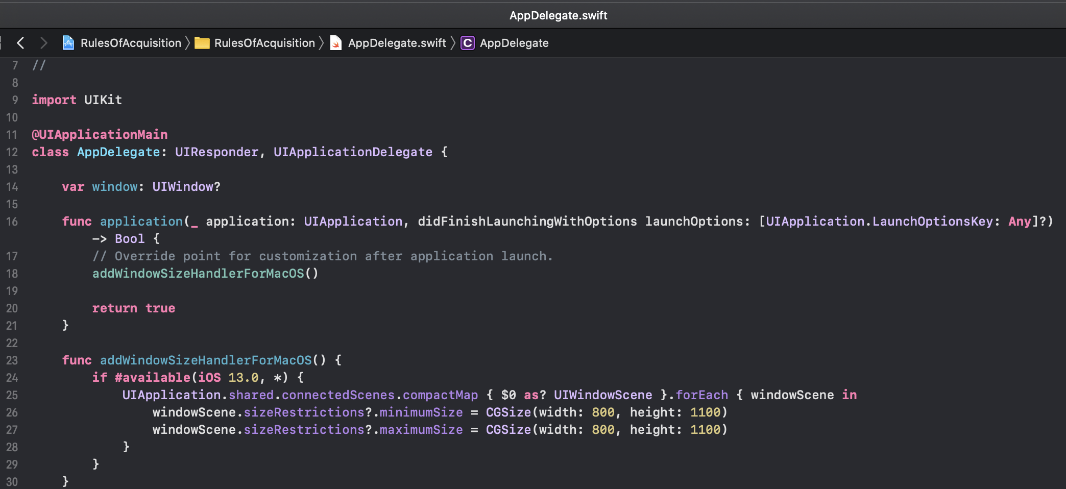 在我的应用程序中,我从第23行开始定义了一个名为addWindowSizeHandlerForMacOS()的函数。然后我从AppDelegate.swift中的application()调用它(第18行)。