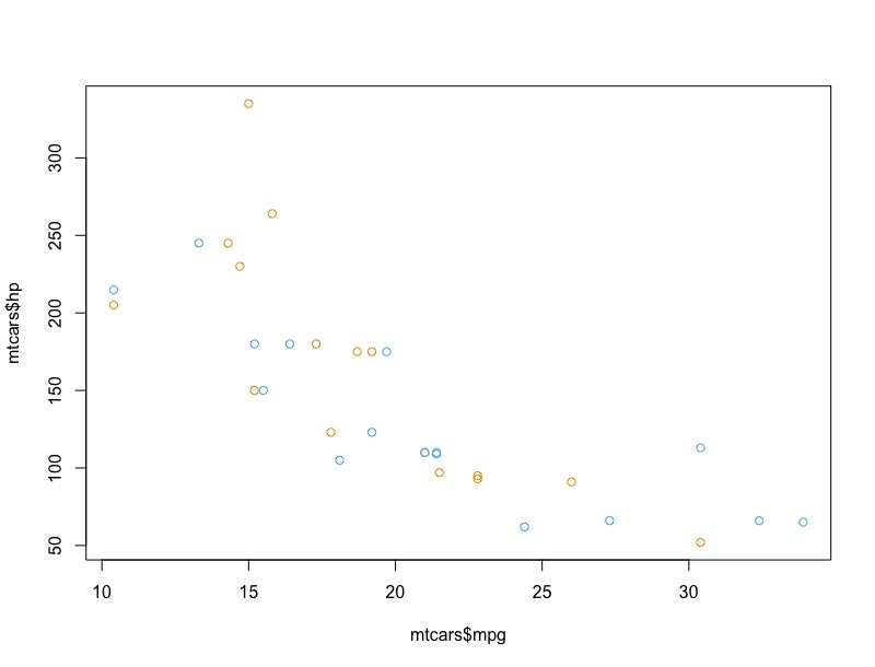 plot(mtcars$mpg,mtcars$hp,col=c(customorange,customskyblue))