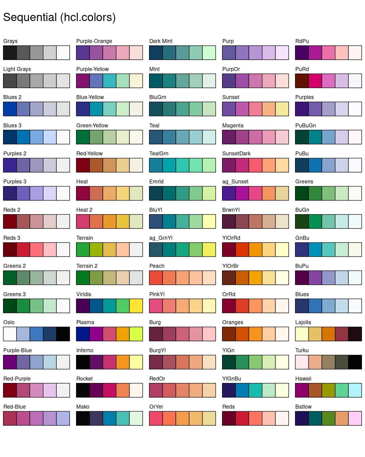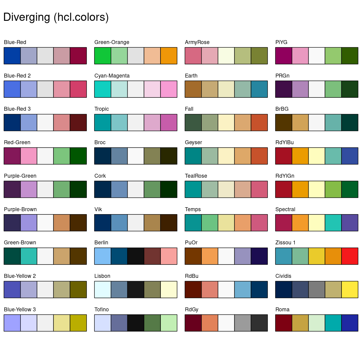 ,从3.6.0版本开始,它使许多顺序和发散的调色板可用,在色觉缺陷下也是健壮的。它提供了来自ColorBrewer.org、viridis、CARTO颜色、Crameri的科学色彩等多种调色板的近似(使用色调-色度-亮度模型)。默认的是流行的viridis调色板。下面的博客文章提供了更多的细节,关于colorspace