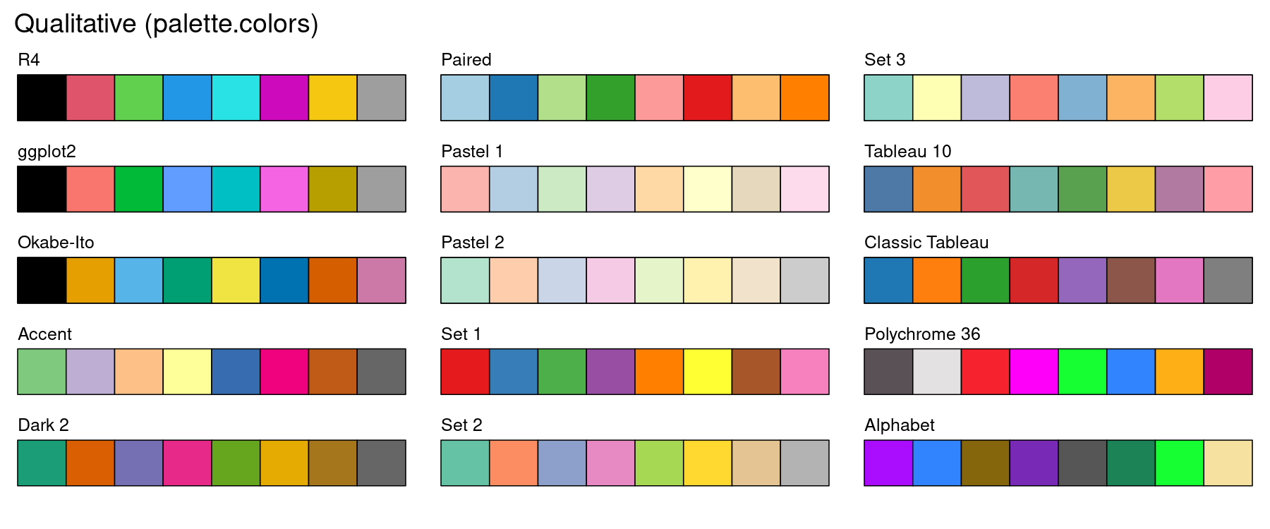 随着这个调色板,各种其他质量调色板可以很容易地在基本R,特别是,新的默认调色板(称为"R4"