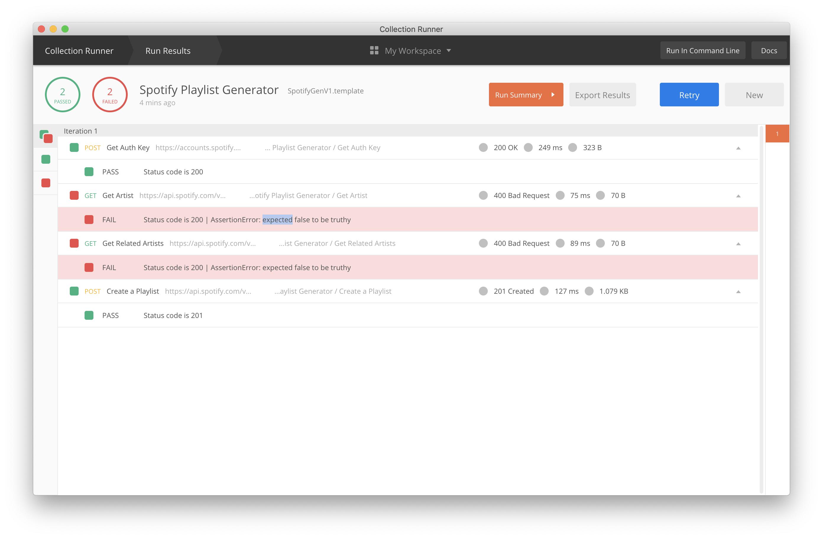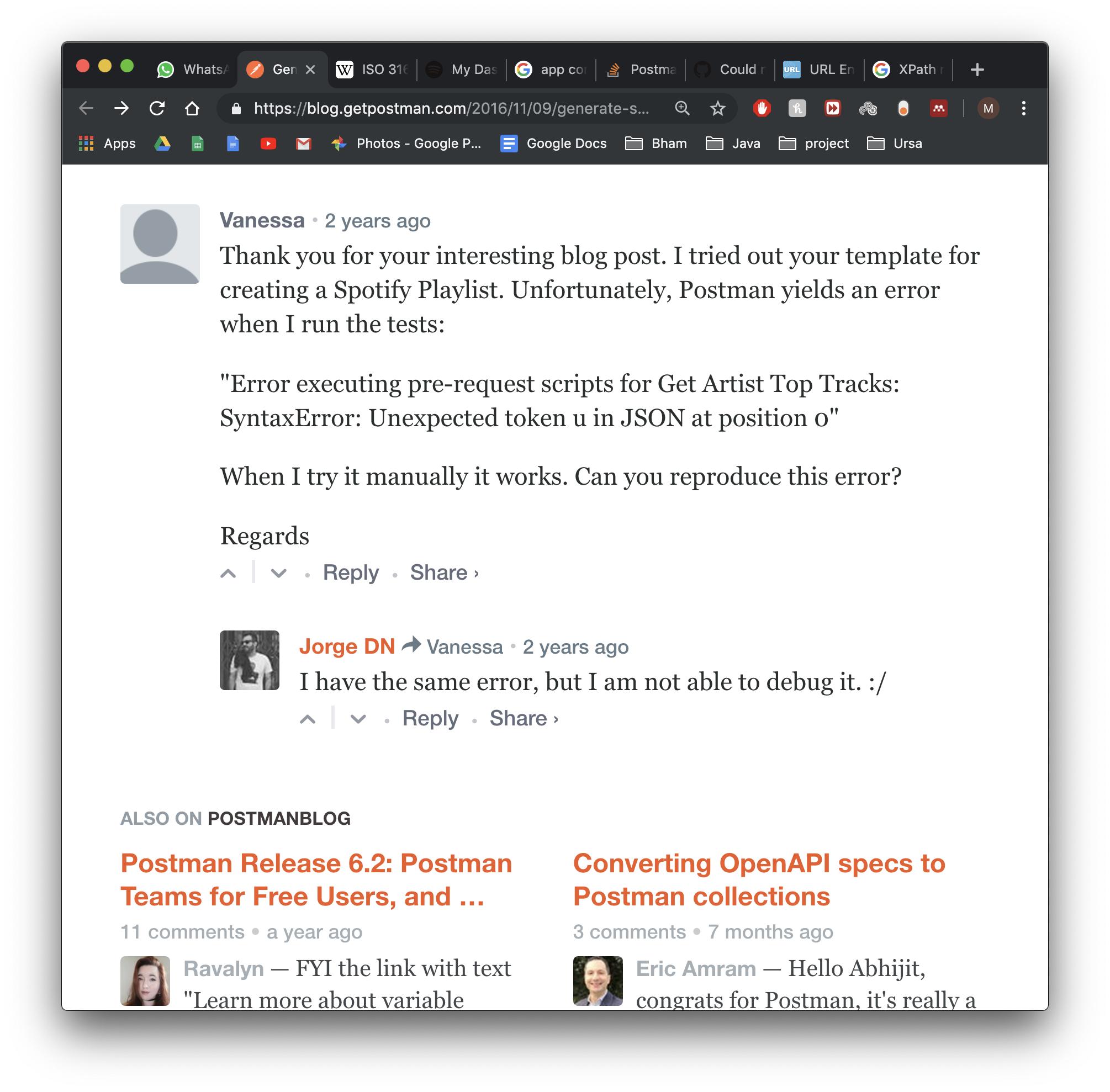 重现错误的步骤:https://blog.getpostman.com/2016/11/09/generate-spotify-playlists-using-a-postman-collection/