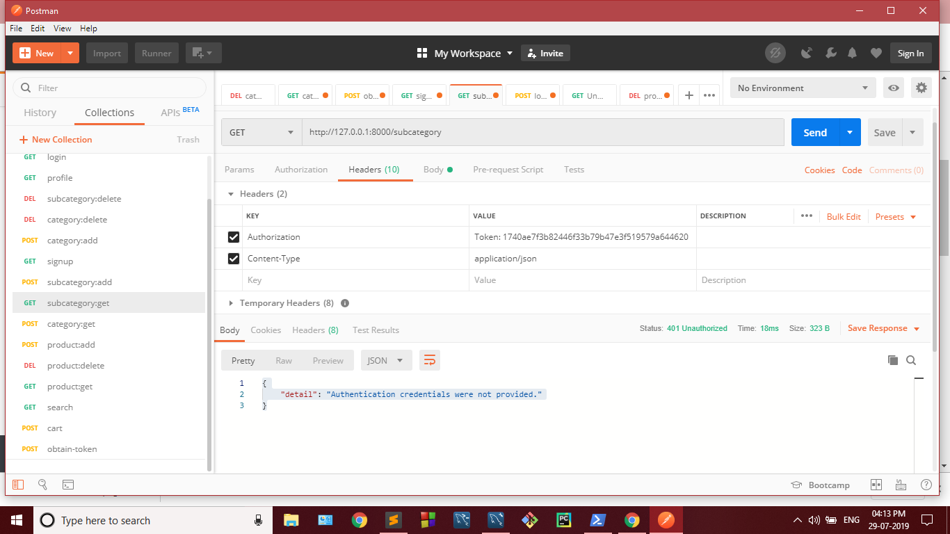 curl -X GET http://127.0.0.1:8000/subcategory/ -H 'Authorization: Token 1740...20'https://stackoverflow.com/questions/57252306