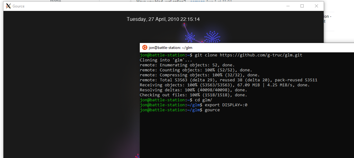 export DISPLAY=:0 在您的linux终端中,当xming服务器正在运行时。旧的openGL应该是非常好的,虽然我建议更新的版本,因为它们应该更有可能与各种新的硬件相抗衡。如果您想测试这个问题是否是您的应用程序,下面是导出显示后在WSL ubuntu上的xming窗口中运行的另一个名为gource的应用程序的快速示例。我下载并安装了一份新的xming拷贝,运行了一次,什么也没有碰过,我克隆了GLM的github,然后在目录中运行了gource