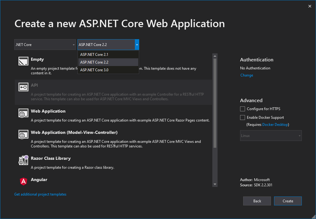 单击Create按钮总是会立即创建项目,使用安装在我的机器上的最新.NET核心版本。