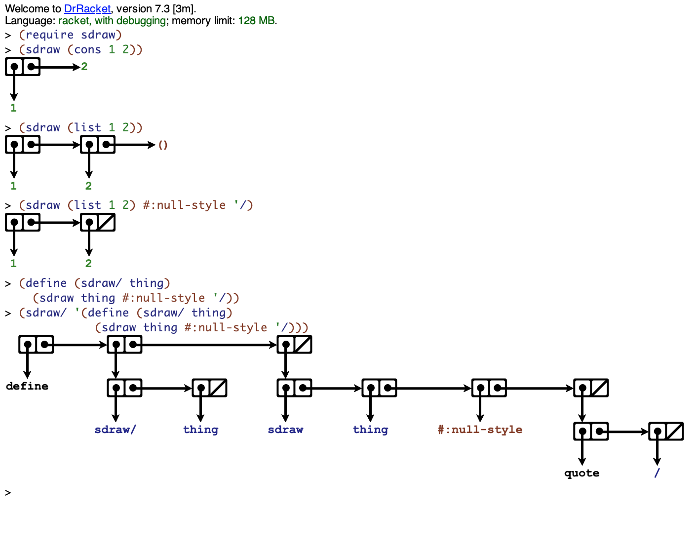 学习方框和指针图如何工作的一个好方法是能够与知道如何绘制它们的程序对话。在Lisp很久以前的黄金时代,我们的Lisp机器上有很好的对话接口,可以将图形和文本混合在一起,还有很好的图形绘制程序,可以轻松地从这些程序中构建工具来实现这一点。使用这些工具,您可以使用conses构建各种结构,并让程序为您绘制图表,从而很好地掌握了这些结构的工作原理。