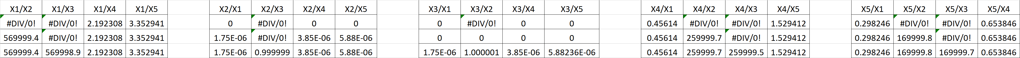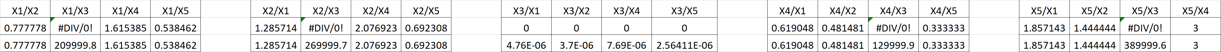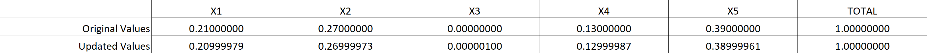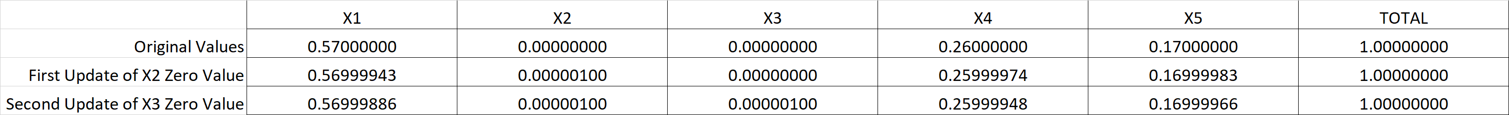 对于虚拟df中的第三行,事情变得更复杂了。我通过添加一个小数字来更新第一个(X2)零值。第二个(X3)零值保持为零,因为公式是乘以零并除以零。因此,我进行了第二次更新,使X2和X3现在是小的非零值,这显示在下表的第三行。