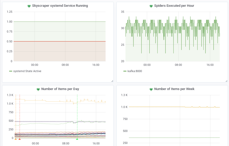 这是我的活动监视器的截图。“每天的物品数量”图表中的每一行都是一个蜘蛛,而我当前的触发器是“1以下”。也就是说,如果蜘蛛完全失败了,我会收到一封电子邮件。由于有些蜘蛛可能有数天没有数据,我有另一个触发器“每周的物品数量”。