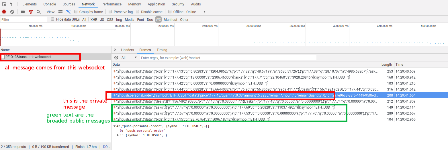 记住这一点,其余的都很容易解释:服务器现在可以使用通常的方法来进一步识别客户端。在这样一个市场上,这通常只会发生在登录。之后,服务器知道具有唯一ID的WebSocket连接属于您的特定用户帐户。从现在开始,它将开始不仅将“公共”信息推送到您的WebSocket连接,而且还会将仅用于您帐户的私有信息推送到您的帐户中。