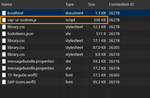 例如,在上面的屏幕快照中,sap-ui-custom.js