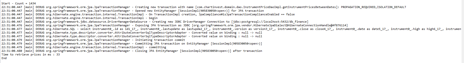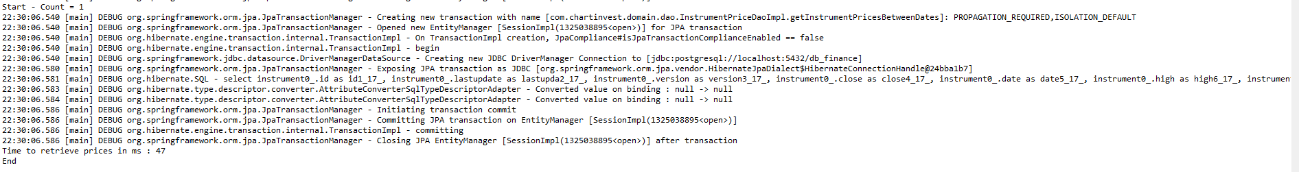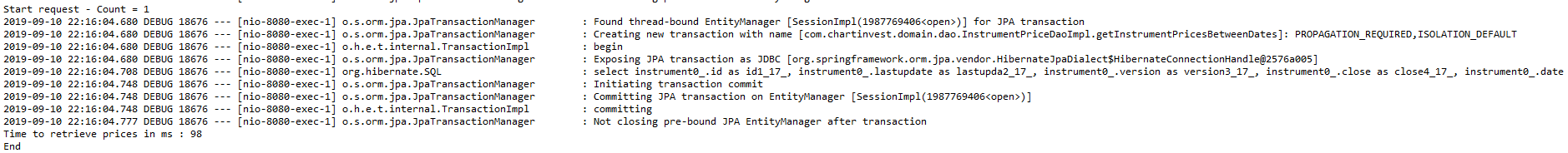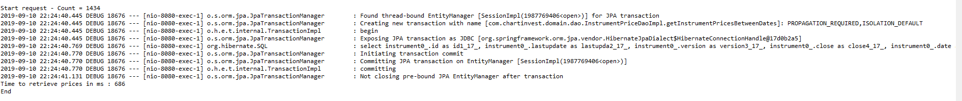 但是,当我在Junit "@RunWith(SpringJUnit4ClassRunner.class)“中启动相同的查询时,查询不会变得更慢。每个查询都需要+- 37。