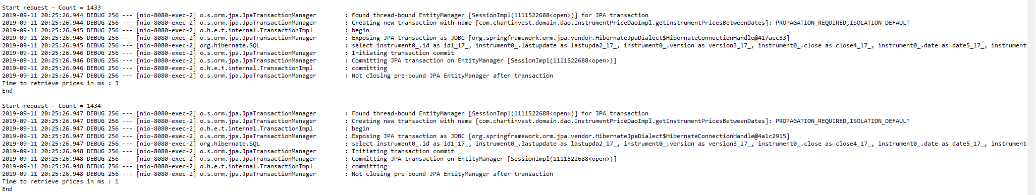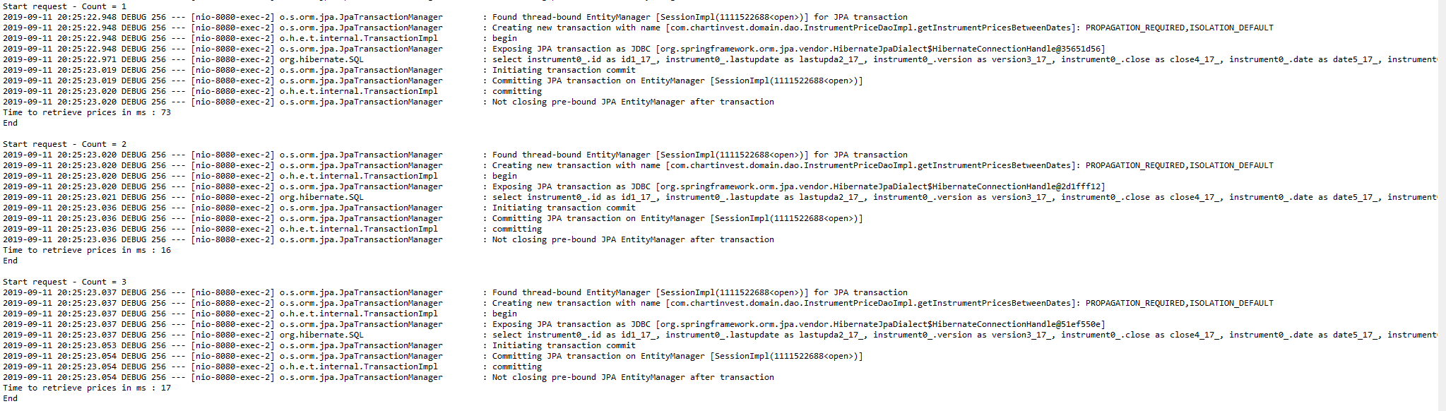 正如您在日志中看到的那样,一个不同之处是,在Tomcat上的每次迭代之后,Entity并不是关闭的(但它在JUnit上是关闭的)。经过1k的迭代后,实体管理器将在内存中保存许多对象,并且在这样一个加载的上下文上的操作将变得非常昂贵。在每次迭代中,记忆压力也应该越来越高。
