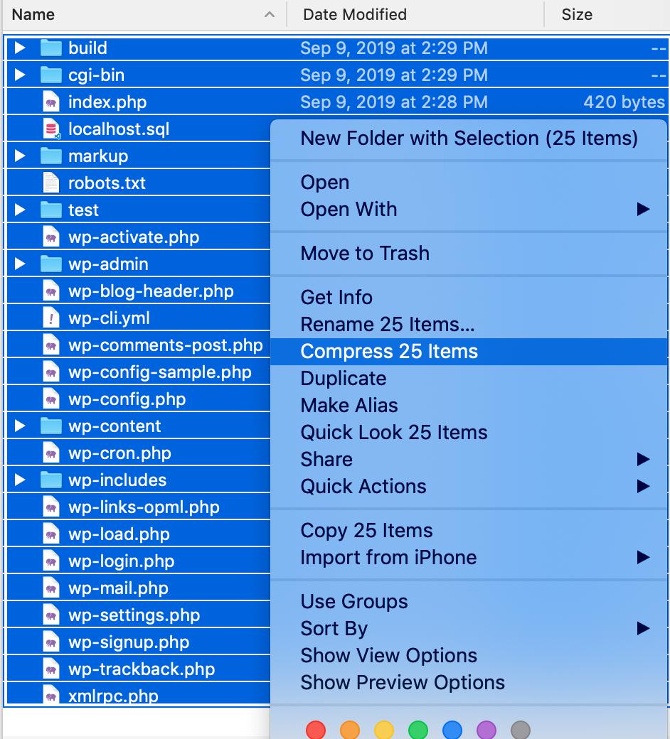 我将导出的.sql文件与通过FTP下载的站点文件放在一起,并创建了.zip存档。